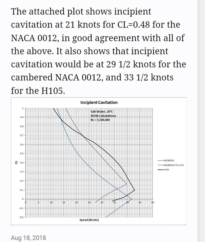 Nah https://www.boatdesign.net/threads/f...xpected.53927/ el tío retuerce el XFoil hasta que le dice lo que quiere escuchar Resulta que él mismo reconoce que estaba tan entusiasmado con el proyecto que la Nariz del supuesto perfil 0012 le ha salido de aquella manera y, encima, para rematar la faena lleva mucho ángulo de ataque, y además solo se escucha el burbujeo de la Cavitación, de todas formas el hilo es muy interesante: participa el profesor Drela y más interesante: Tom Speer, que en paz descanse, que trabajó en la Boeing y estuvo es varias campañas de la Copa América en la época más reciente de los Catamaranes Separación, Cavitación, Ventilación Lo peor es Ventilación . |