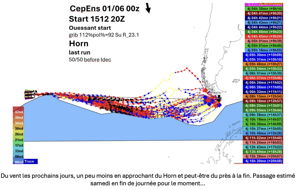 El rutening se centra en un antes y un después del Cabo de Hornos, el sistema de baja presión que se forma en el norte y bajará por la costa chilena influirá en la dirección e intensidad del viento. Mientras Simon Fisher y Phil Legros se centran en la otra parte del Cabo siempre muy compleja, intentarán hacer la mejor ruta.
