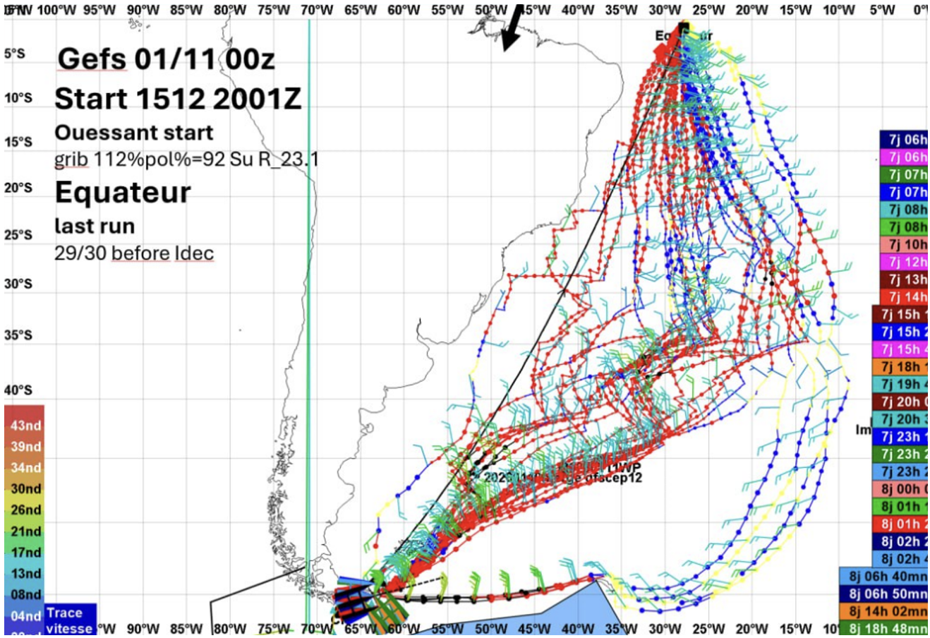 Les va bien la ruta E, han dejado Malvinas a Br. Un escenario bastante solido entre 40º y 30º pero con mucha dispersión después . El routennng es una locura con los diferentes modelos analizando incluso los locales, pero al final todos convergen. No va mal, la ventaja aumenta hasta las 446´.