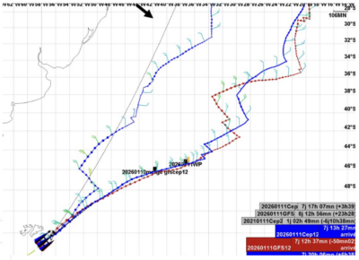 La fiabilidad de los modelos meteorológicos sigue siendo fundamental en las conversaciones estratégicas entre el equipo planificador de las rutas (rutenning) en tierra y el trimarán. El modelo europeo ECMWF revertió su postura ayer, proponiendo una ruta hacia el oeste. Sin embargo estas rutas parecen muy arriesgadas y complejas de ejecutar, ya que implican transiciones críticas entre sistemas meteorológicos inestables. Si bien es poco realista en condiciones reales, una sola variación en un parámetro puede provocar el colapso de todo el sistema.