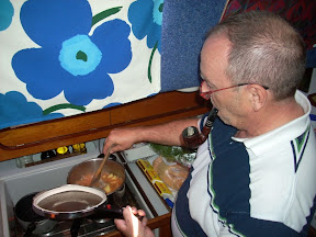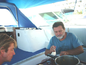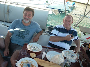 Poco antes de comer el “Tunante” se amarra también al muelle del combustible. Es otro forero que, con su Beneteau 350, baja hacia el sur. Charlamos un rato y nos ponemos a preparar la comida. Ellos comen migas. Nosotros patatas con costillas (otra vez. Se nota que tengo tripu agradecida).