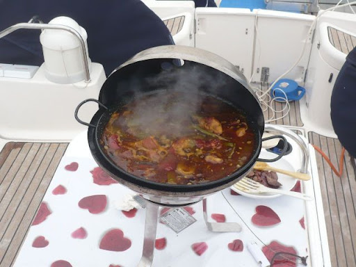 Aqui teneis una paella echa a bordo, en este caso por el cofrade Trisquel, mi mujer tiene una experiencia abismal para hacer cualquier comida navegando este el barco como este, si no que lo afirme algun cofrade de los que navegan con nosotros y con la cocina tal como esta sin pornele nada encima, saludos libra.
