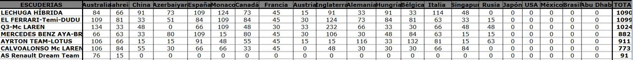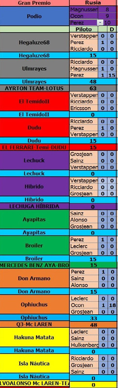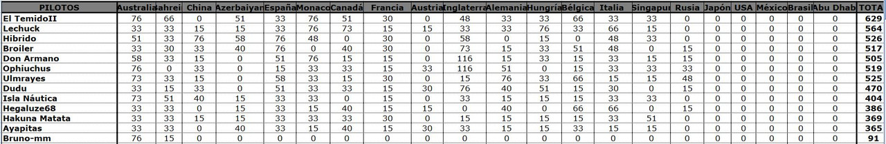 Preocupante lo de Mc Latas que si no hubiera habido problemas entre los Red Bull y el Ferrari de Raikkonen Alonso hubiera quedado 3 puestos más abajo; según dicen si Mercedes Benz tiene el "modo fiesta", Mc Latas debe tener "el modo SIESTA" a juzgar por su último desempeño. Por el lado del campeonato tabernario de pilotos: El Temido II toma la punta con 142 unidades, seguido por Isla Naútica con 124 y Ulmrayes captura el 3er escalón con 106. ![]() ![]() El campeonato de constructores queda posicionado con: El Ferrari Temi-Dudu y el Calvoalonso Mc Laren Team empatados con 190 seguidos por el Ayrton Team Lotus con 172. ![]() ![]() ![]() Ejemplos para aclarar puntajes. Votación Temido II ![]() En este caso los 66 puntos se obtienen de la siguiente manera, siempre respetando el nuevo orden que es de menos a más. 15+15 puntos por el primer acierto exacto, más 18+18 por el segundo acierto exacto, total= 66. Votación Don Armano ![]() En el caso de Don Armano, el tiene sólo un acierto exacto (en la 2da posición) por lo que su puntuación resulta de sumar 15+18= 33 puntos. Si Don Armano hubiera acertado solamente de manera exacta la primera posición su puntaje hubiera sido el resultado de sumar 15+25=40 Espero que las cosas se vayan aclarando. Comento aquí las ventajas de este sistema que le podriamos llamar Hegaluze 2.0 con respecto al anterior. En el anterior Tenia que colocar las votaciones (nombres de los pilotos) manualmente, lo mismo con el puntaje de cada posición es decir al primero asignarle 25 o 50 si era acierto exacto, luego el sistema me sumaba todo. Esto funcionaba así tanto para el de pilotos cómo el de constructores. Finalmente tenia que meter en ambas tablas de manera manual la sumatoria automatica para que me tirara los graficos. Esto evidentemente era propenso a muchos errores. Por estas latitudes muchas carreras empiezan a madrugada así que el sueño tambien hacia de las suyas y sumaban más errores y evidentemente ante cada error, volver a corregir todo. Con la versión Hegaluze 2.0 ahora votar por cada posición es sólo elegir en una tabla desplegable el nombre del piloto votado para la apuesta de una determinada posición. Al final de la carrera sólo coloco los nombres de los pilotos que ocuparon las posiciones que tocaron para esa carrera y la nueva tabla hace todo solo. Tira posiciones tanto para el campeonato de pilotos y constructores de maneta automatica sin posibilidad de error y los presenta en una tabla. Cuando Hegaluze me comento todo lo que hacia la tabla nueva me encanto pues aparte de ahorrarme un 90% de tiempo, ya se eliminaba la posibilidad de error. Confieso que a dos días antes de iniciar el campeonato no entendia completamente la forma de sumar, pero bueno los beneficios a pesar de la complicación inicial superaban con creces las dudas iniciales. y al fin de cuentas, todas las posiciones exactas seguian sumando 116 puntos. Si hay dudas con respecto a las puntuaciones, sólo consultar, no problem y birras para Hegaluze que me a hecho ganar mucho tiempo en presentar las estadisticas. Seguridad y Mantenimiento (por el Taller de la Puri) Agotado despues de un día todoterreno? Sin fuerzas para sacar ese barro rebelde? Su parabrisas quedó lleno de insectos destrozados? No se preocupe en el Taller de Puri hay expertas en limpieza.. Sólo tenga lista su billetera y su American Express Centurión. ![]() ![]()
