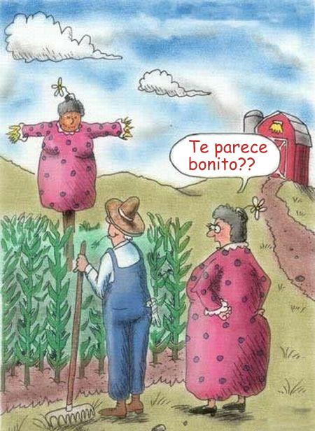 - Vaya, ¡otra vez los cuervos se me han comido la cosecha! - Pero hombre, haz como yo, pon un espantapájaros. - Si ya lo pongo, pero como si nada. - Lo que tienes que hacer es pegarle una foto de mi suegra. - ¿Y eso es efectivo? - Mira, a mi los cuervos no solo no se me han comido la cosecha, sino que me han devuelto la del año pasado.