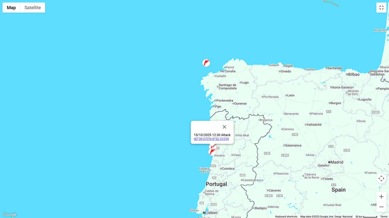 El ataque al W de Ferrol el 13, otros dos también el 13, muy juntos y seguidos al NW de Aveiro y otro ayer 15 al mediodía enfrente a la barra de Aveiro