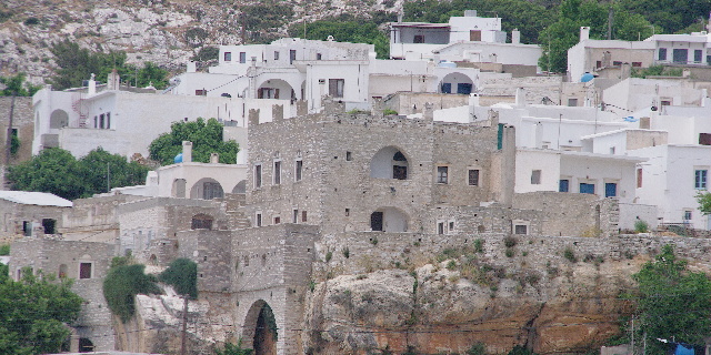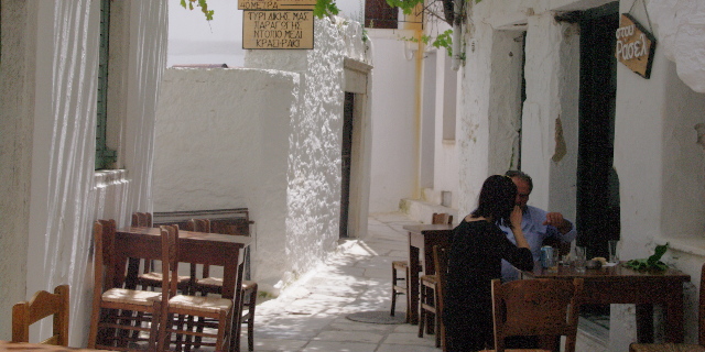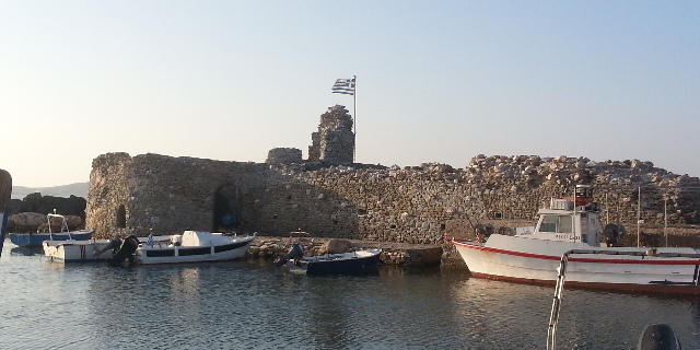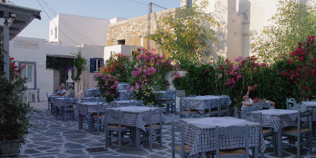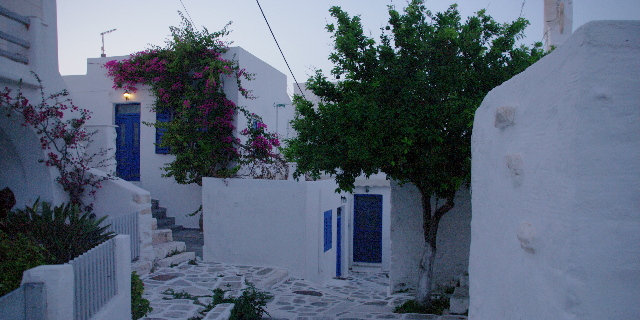 Lo que observamos desde el barco no invita a explorar nada. Seguramente otro arrebujo de restaurantes como Naousa. Solo salimos a dar un paseo cuando el sol casi se ha puesto.
