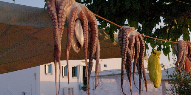 Y los "Octopus" colgados al sol decoran muchas de estas tabernas, entre las que por fin aparece una con nombres sugerentes y mas de cocina del siglo XXI. Nos proponemos probarlo esa noche, pero al llegar, entre todos los restaurantes llenos a rebosar nuestra elección está completamente vacía, lo que nos deja un tanto perplejos y poco dispuestos a experimentar.