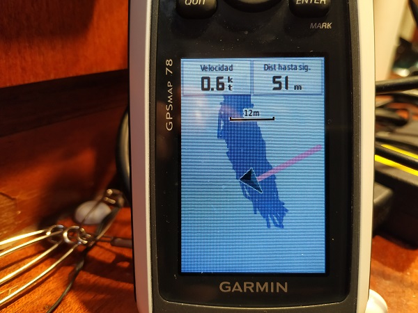 En el GPS de mano pongo un WP donde está colocada el ancla que en este caso son 50m hasta la mesa de cartas y en la pantallita queda reflejado el track, con un simple vistazo se ve que no has salido del dibujo que constantemente va dejando