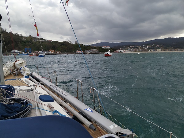 Así que por este motivo y porque prefiero levantarme por la mañana, saludar al vecino, un velero inglés fondeado a una cincuentena de metros mío, ver la ría y el movimiento de los pesqueros, a no estar metido en una desolada marina de solitarios barcos, un panorama desolador