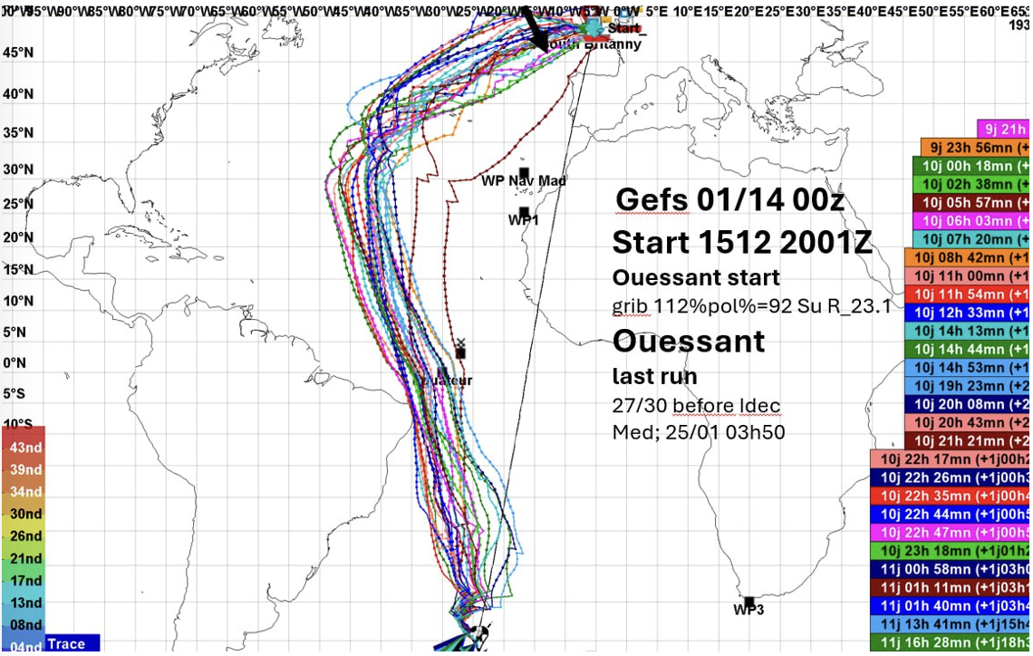 No pueden capear para entrar en el Golfo de Vizcaya. Es un record. No sé no estoy delante del Pc y un análisis más profundo no lo puedo hacer. Dicen tener una posibilidad. Pero se ve aún más duro que los mapas del Noaa. Esperemos que puedan pasar sin problemas pero va a ser durísimo. Dicen que la hora de llegada estaría entre la noche del sábado y el domingo. Hoy en Cabo Bagur dicen que han medido olas de 10 m pero el Golfo de Vizcaya está imposible