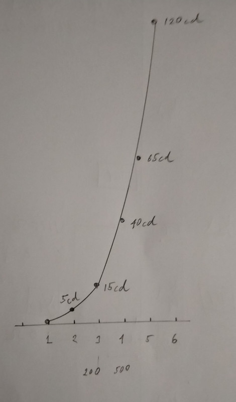 Y De Candelas a Millas pues más o menos la idea es esa curvita de arriba: para que se nos vea a 6 millas necesitaríamos tal vez 120 imposibles Candelas, pero para que se nos vea a 3 millas se puede conseguir con tal vez unas 15 Candelas
