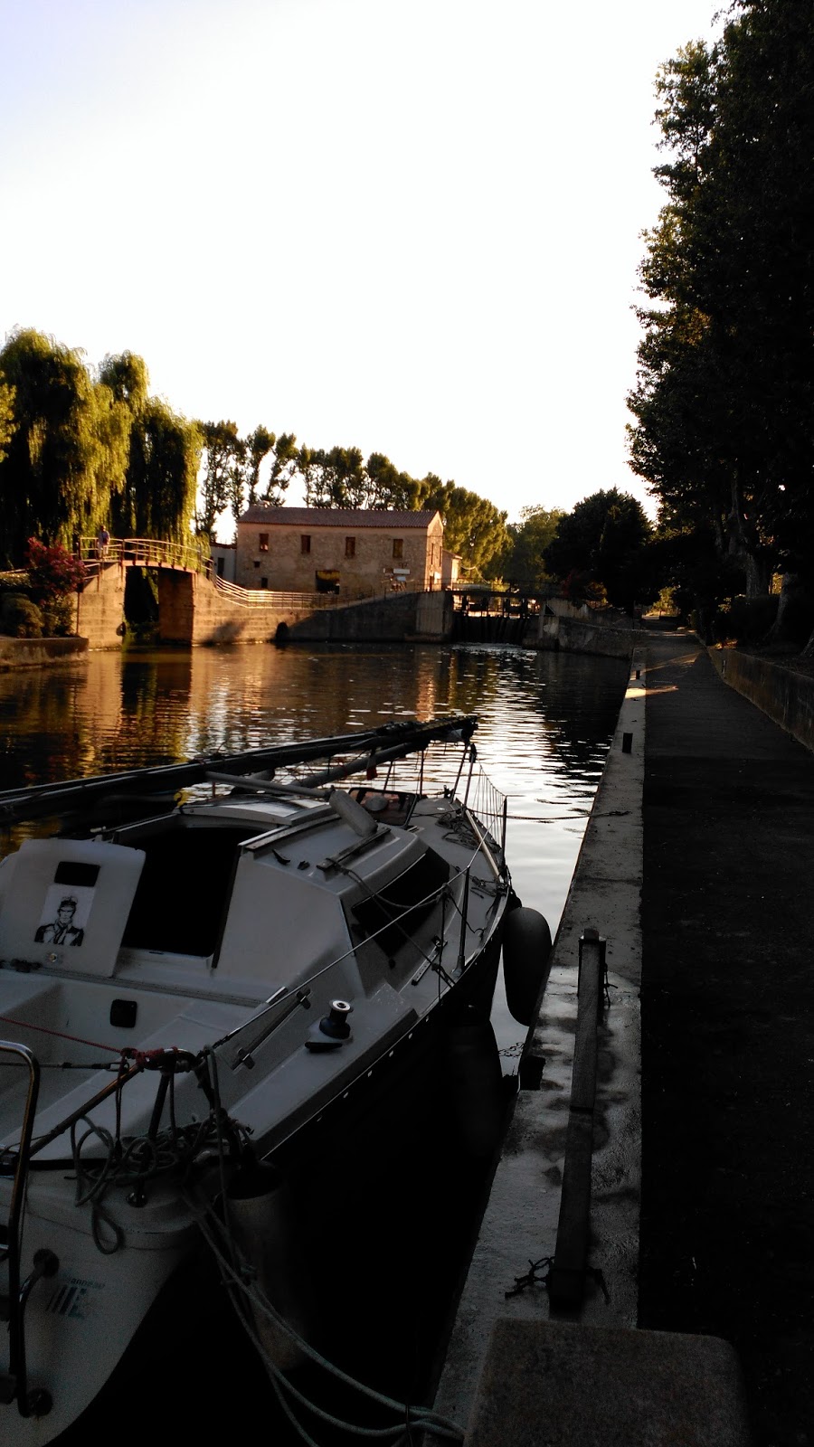 La navegación a la isla de Elba tocaba a su fin y se despediría con iguales inquietudes que con las que comenzó. Murphy, ese incómodo polizón que se metió al barco al principio del viaje cuando estaba de espaldas y con la guardia bajada, seguía ensañándose con nosotros. Nos tuvo retenidos 4 días en Narbona, esperando a ver si el dichoso permiso internacional le llegaba al transportista que venía a recogernos desde Euskadi. Y ello con la amenaza de que el fin de semana se cierra la frontera con Francia a los transportes pesados, y nos podía pillar. Por si fuera poco hacía un calor de derretir coletas (estábamos a finales de julio) y nuestro atraque en el canal sólo recibía la sombra al atardecer, por lo que nos pasábamos una parte del día en la oficina de turismo, que tenía un sofá y aire acondicionado. Además la neverita que habíamos comprado al principio del viaje, al fallar la anterior, también rindió su alma, y ahora teníamos a bordo dos pero las dos estropeadfas. Eso sí, esos días nuestra casita con jardín y vistas al canal había amarrado en un muelle solitario, con agua y luz, con el ruido del rebosadero de la esclusa de fondo como si fuera un riachuelo. Y como era el muelle de espera de la esclusa, cuando nos fuimos lo hicimos sin tener que meter la mano en el bolsillo. Cuatro días en el centro de Narbona gratis total. Ver entradas del 27, 28 y 29 de julio de 2016.