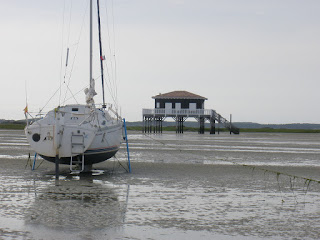 El Corto Maltés es de orza abatible pero tiene en el fondo un quillote en el que se apoya. Este quillote es una seguridad pues es de hierro, y si te posas en fondo irregular o que no sea de arena aguanta mejor que si apoyas el casco de fibra de vidrio, que puede fisurarse si pilla debajo una piedra o una concha. Pero a cambio ofrece un equilibrio precario que hay que mejorar con los puntales. En España los puntales se usan poco, y conseguir los del Corto Maltés para la navegación a Bretaña en 2015 me costó un triunfo y tuve que encargarlos a Francia. Sólo sirven para varar en fondos duros, cómo éste de la Isla de los Pájaros, en Arcachón:
