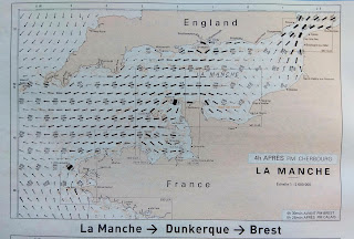 • Planificar las etapas sin tener en cuenta las corrientes de marea. Grosso modo el Canal de la Mancha se "llena" al subir la marea desde el Este y desde el Oeste hacia su centro (siguiente foto: marea entrante):
