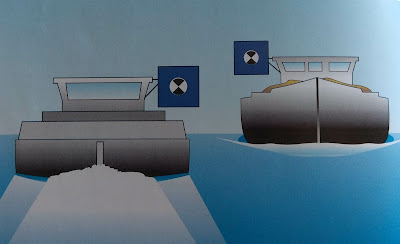 Otras veces te encuentras barcos que por sus características (normalmente porque quieren elegir la parte más honda de cada meandro) te piden que te cruces con ellos al revés de lo normal (en vez de babor con babor, estribor con estribor). Para indicarlo exhiben en el costado de estribor un cuadrado azul o una banderola azul, o una luz blanca centelleante. Obviamente eso exige una vigilancia estricta cada vez que se te acerca uno por la proa, con los prismáticos para que te dé tiempo a anticipar lo suficiente.