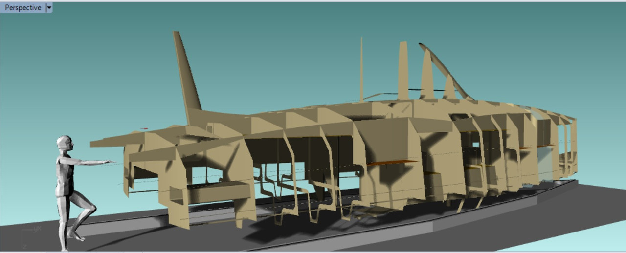 En el diseño se ha definido un plano que representa el suelo: ![]() lo que hago es medir en el diseño las distancias entre los puntos que me interesan para situar correctamente cada pieza. Con esto, coloco la pieza a una altura respecto al nivel teórico de la nave y a una distancia de la anterior sección, confirmo la alineación y la vertical y se supone que está en su sitio... ![]() ![]() |
