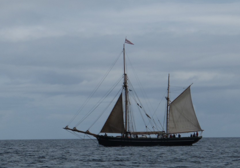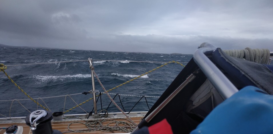 Al tercer día desde que llegamos a Hébridas sopla de carajo, la borrasca al desplazarse al este hoy toca viento del oeste, bien para seguir haciendo norte con entre treinta y cuarenta nudos, con todo bien trincado, solo con poco más de medio foque corremos como alma que lleva el diablo, por encima de ocho nudos, Navegamos a cubierto por la barrera de islas que tenemos a nuestro barlovento. eso sí, con ola de poca altura, pero algunas desmadradas, que de cuando en cuando chocan contra el casco nos refrescan con buenos chaparrones y el agua a 12 grados, aunque vamos bien equipados y apenas se nota el frío.