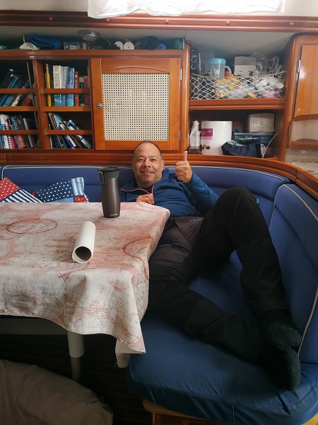Rufino cada día lo lleva mejor eso de no salir mucho a caminar, se da sus paseos por cubierta tres veces al día para sus necesidades y el resto tumbado en su cama economizando energía.