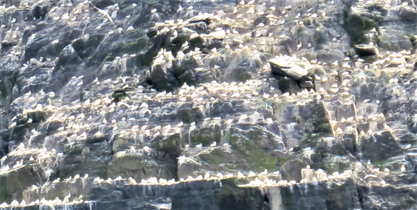 Las Skellig no me han defraudado, estos dos pétreos islotes, como clavados en el mar, a ocho millas de costa, albergan toda una diversidad de aves, araos, alcas, fulmares, alcatraces, gaviotas y como no, por fin he podido contemplar los esquivos frailecillos, e incluso fotografiarlos desde lejos, porque a nada que te acercas se sumergen rápidamente. Hasta las islas se acercan lanchas con turistas desde la vecina villa de Portmagee, donde me dirijo, no sin antes acercarme a la pequeña Skellig, impresionante este peñón enteramente rocoso que desde la lejanía parece nevado, pero no, no estamos en el mes de enero, no es otra cosa que el blanco plumaje de la colonia de miles y miles de alcatraces, que habitan apretujados hasta el último rincón del peñascal.
