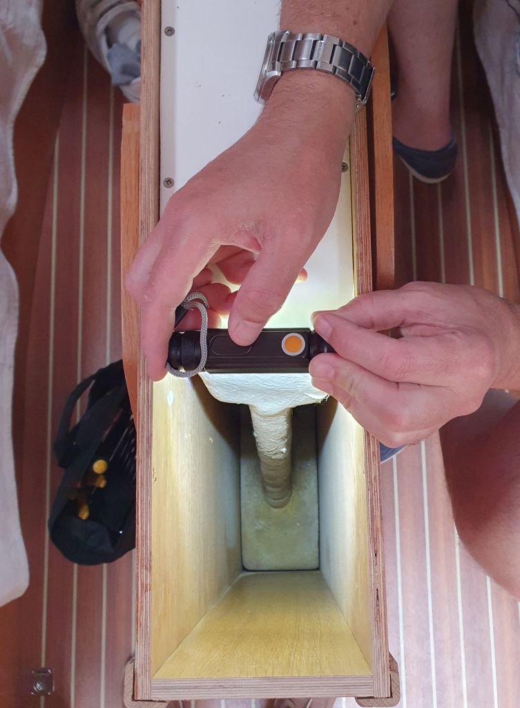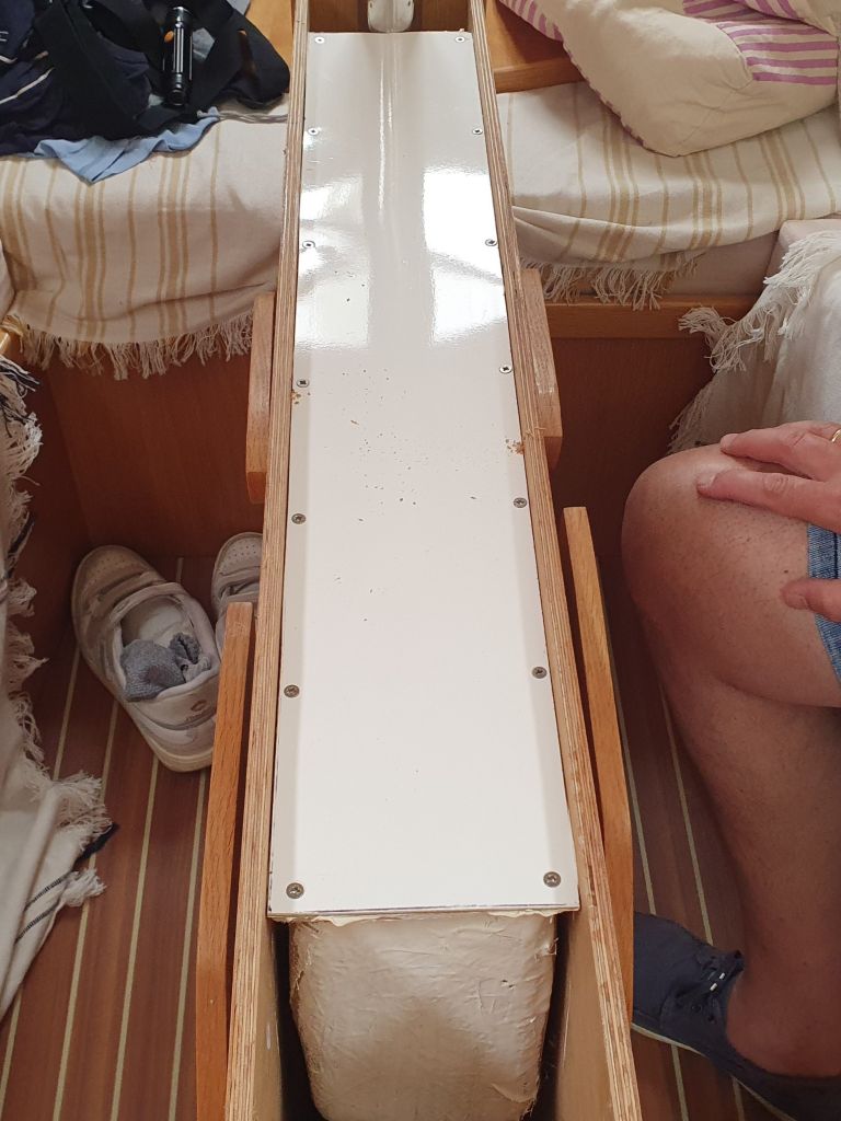 Después de desmontar la mesa, siete tornillos, se accede al hueco de debajo, caben veinte kilos de harina más o menos (para consumo propio) en el hueco que dejaron sin usar que bien venía para el puñetero extintor. En él hay un registro tapado con una plancha de fibra atornillada con tornillos y sellada con sicaflex. El Sika acojona un poco, habitualmente no hay quien lo despegue sin montar el lío de la cabra, pero en este caso, a pesar de cumplir su función de dar estanqueidad a la caja de la orza, despega milagrosamente fácil de la tapa manteniéndose firme en la caja, casi parece una junta. Hay que investigar donde está el truco del Sika antes de volverlo a montar, o usar cinta de butilo, porque pegado con Sika de la forma normal, no lo abre otra vez ni Perry.
