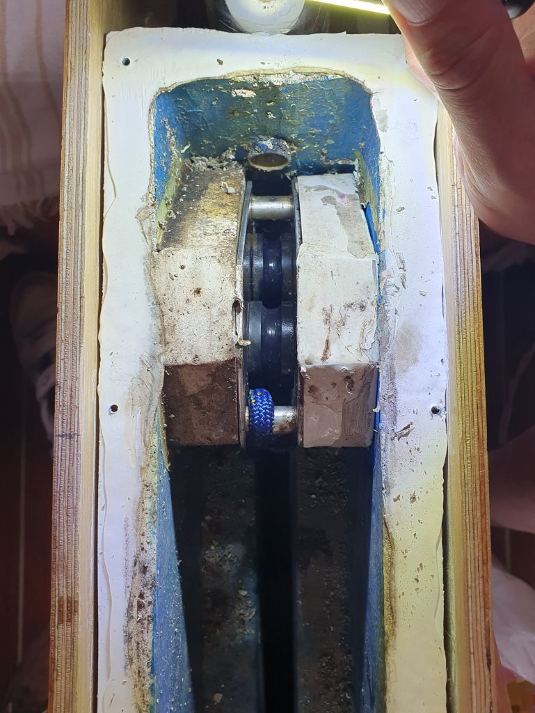 Una vez abierto el registro, el aparejo de violín de elevación de la orza está claro y totalmente accesible. No hubiera hecho falta quitar los tornillos laterales que sujetan las poleas y quitarlos no sirve de nada.