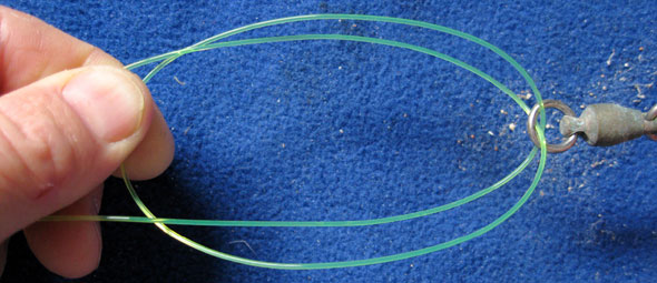 El cast-paw es el mejor nudo para anillas o quitavueltas con toda certeza, siempre con tres vueltas. Stewart Campbell ha realizado múltiples test, el mejor de ellos tiene el monopolio de records de Blue-Marlin en las pasadas dos décadas. El cats-paw básicamente consiste en rotar el quitavueltas o la anilla por el bucle creado en una doble línea tres veces. Tanto si lo que vamos a atar es una anilla u otro artículo metálico, o si es otra línea el proceso es el mismo, pon la doble línea a través del ojal o del loop de la otra línea (FOTO 1)