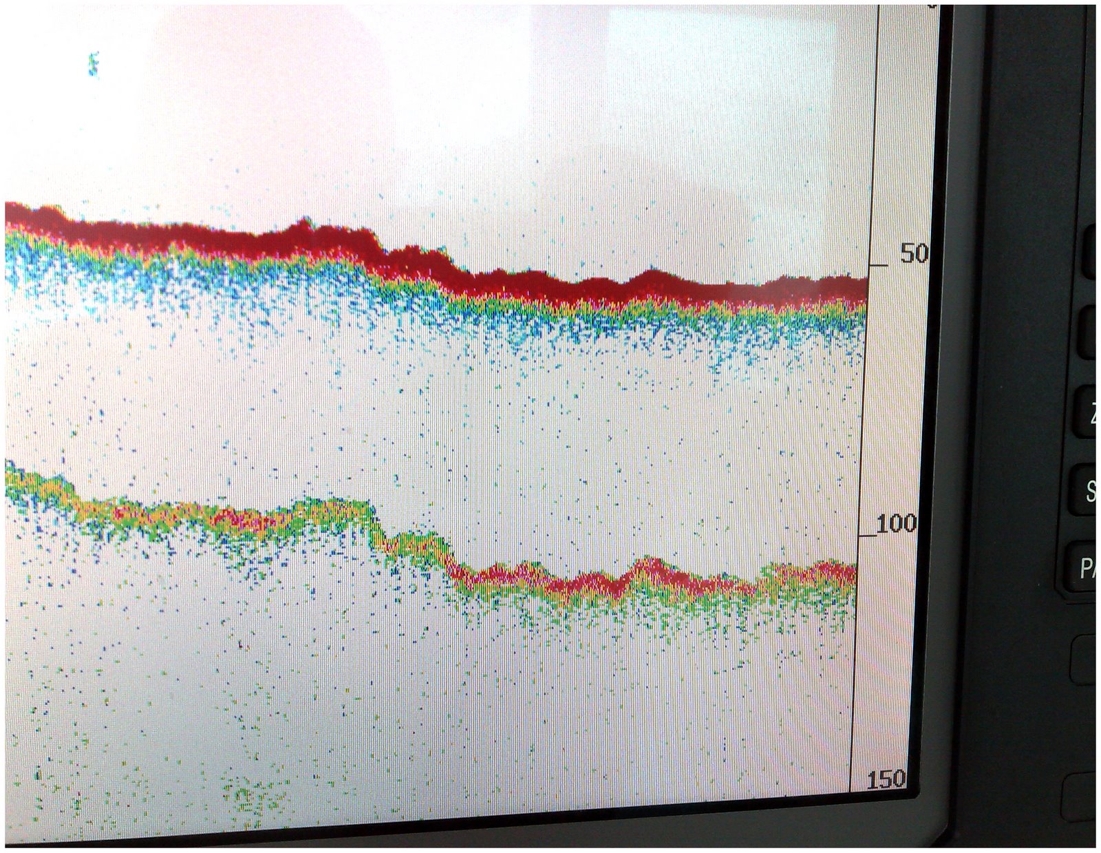 Con respecto a la pantalla que analiza el Marqués estoy bastante de acuerdo con él, creo que el fondo todo es roca dura, no estoy tan seguro de que los peces sean peces, más bien parecen montones de alga, patexo o como mucho bandos de engado, y creo esto porque veo una pantalla muy limpia, que me dice que está con la resolución baja, o en automático para despreciar porquería en suspensión, el doble eco, efectivamente nos diría con exactitud si todo el fondo es roca, pero si analizamos el color rojo tan intenso, y la falta de este color en los bandos de peces llegareís seguramente a la misma conclusión a la que llegué yo.