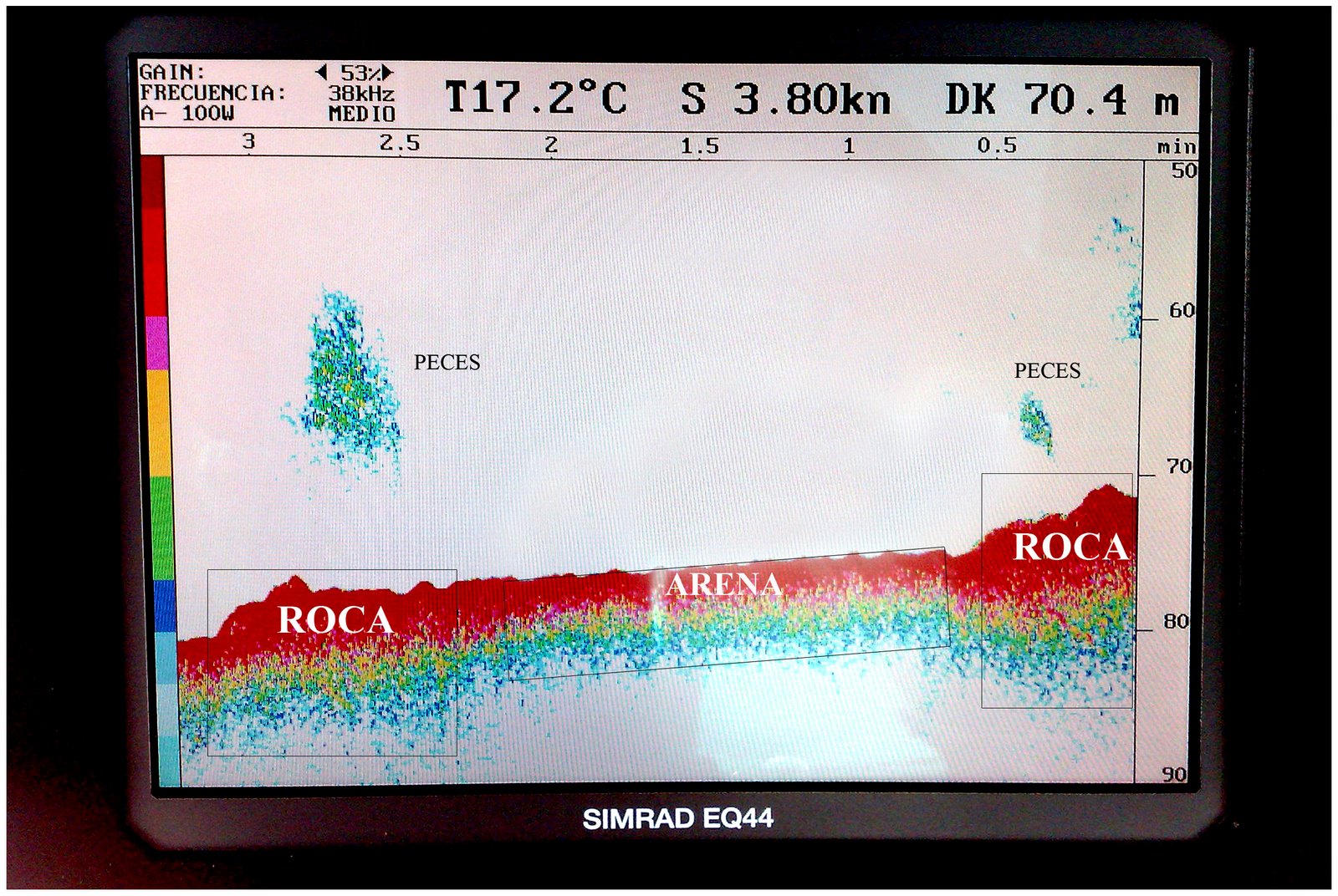 esto lo he sacado de un tutorial de esos..... yo no tendria tan claro que las zonas en las que aparece el doble eco rojo sean piedra y las otras sean arena ( estamos a 50 metos ) y pienso que para eso mejor visualizar un eco que a ese fondo llegas de sobra.....una cosa es que parezca algo mas "duro" pero eso no significa que necesariamente tenga que ser piedra, puede ser cascajo fango duro, grava mezclada con arena...