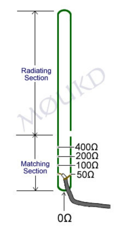 ![]() Las Calculadoras que hay por internet dan un punto de soldadura/alimentación alto En la base de la Antena hay unos 1000 Ohmios En el Transformador de Impedancia hay 300 Ohmios Y en la base del Transformador corto circuitado se supone que hay más o menos Cero Patatero coma unas décimas Pero esta suposición podría ser errónea Tal vez lo más conveniente sea alimentar directamente por la base: ![]() En este dibujo no aparece el 'cortocircuito'; pero es para expresar la sospecha . |