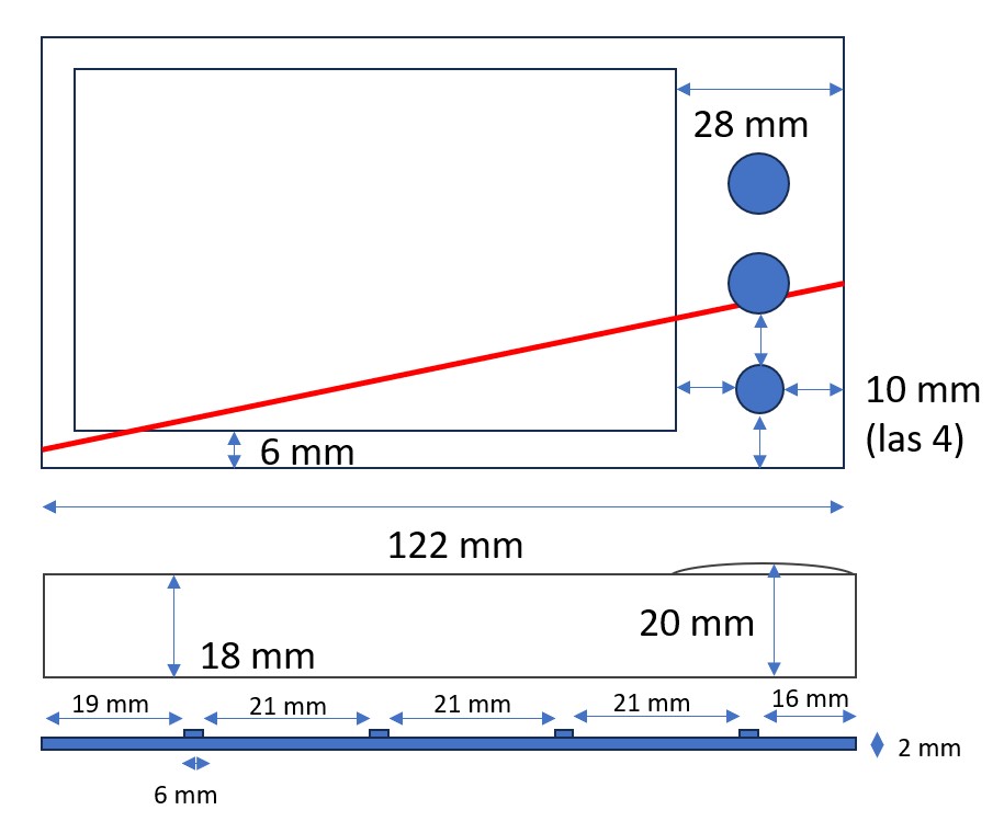 ¿Cuál es el grosor de las paredes? según la foto podrían ser 3-4 mm pero no es para nada lo mismo. Los 3 botones ¿a qué distancia está su borde interior de la orilla de abajo de la caja? cada uno de ellos o distancias entre ellos. Su pongo que van centrados en el espacio de 28mm de ancho.