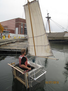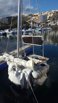 Sí, lo habéis leido bien, un metro, la medida que suelen tener los veleros de juguete teledirigidos. Matthew Kent se ha construido un barco de metal de un metro de eslora con el que intentará cruzar de las Canarias a Florida, 4.700 millas. Lo ha bautizado "Undaunted" ("Impávido"). Más que un barco parece un tentetieso, con más manga que eslora y con una orza profundísima y unos depósitos amarrados a los lados que aumentan su estabilidad. Tiene una sola vela cuadrada, que le permitirá desarrollar una velocidad de 2,5 nudos, con lo que la travesía durará, contando los imprevistos, entre 3,5 y 4 meses (más que el nadador del que os hablé hace unos días). Eso si consigue seguir algo que se parezca a un rumbo, porque con ese casco más parece que estará a merced del viento y las corrientes, como en una balsa salvavidas, que llevando su propio rumbo como en un auténtico velero. Por supuesto en un metro no podrá estirarse para dormir, y ya ha pensado su postura de sueño, con las piernas cruzadas al estilo hindú: Como el barco es muy hondo, la comida la llevará estibada debajo de sus piés: Aquí le veis dando los primeros bordos de prueba en La Gomera: Está claro que el que no navega es porque no quiere, y busca mil disculpas para no hacerlo. Además Mat, con esta aventura, quiere recaudar fondos para una fundación llamada The Bioreserve, radicada en Nueva York, que se dedica a que los chicos aprendan a respetar la naturaleza. Podeís seguir su intento de atravesar el Atlántico en ese minibarco en: https://littleboatproject.org/
