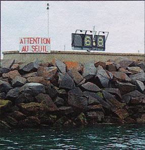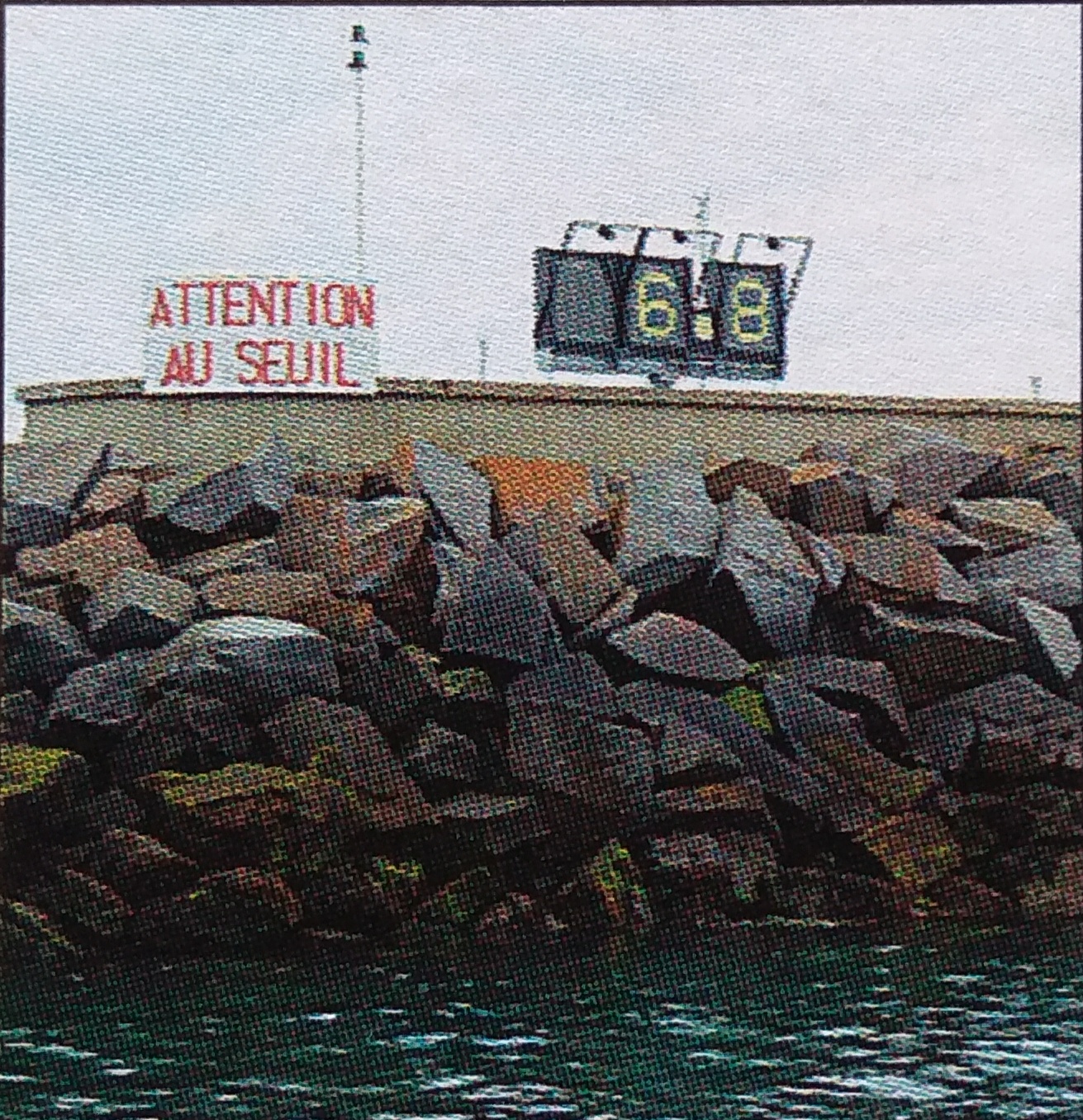La foto es en bajamar, y tenéis que imaginaros que en pleamar los veleros pasan, con su quilla y todo, por encima del muro. El umbral simplifica mucho la maniobra de entrada al prescindir de las esclusas, pero está limitada a la altura que alcance la marea por encima de ese muro y al calado de cada barco. Por supuesto que muchos veleros pueden salir algunos días y otros no, según el coeficiente de la marea. Un panel luminoso o una regla te indican la altura de agua por encima del umbral en cada momento, y tú decides cuándo entrar según el calado de tu barco. Como el Corto Maltés sólo cala 70 cm con la orza subida, nuestra horquilla para entrar es bastante amplia, pero no indefinida. En la siguiente foto hay 6,8 metros de agua sobre el umbral: