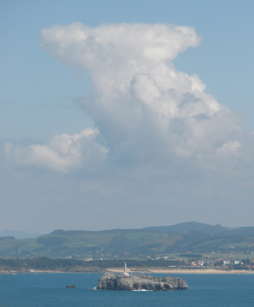 Un fenómeno tormentoso es una circulación violenta de aire en sentido vertical bajo una nube, generalmente un cumulonimbo (esas nubes algodonosas verticales que arriba terminan en una superficie plana, con forma de yunque, como esta preciosa sobre la isla de Mouro, en Santander):