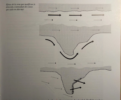 • Pensar que el reforzamiento del viento terminará al franquear el cabo. Como se ve en la figura anterior, el reforzamiento no es sólo un semicírculo que continúa tras franquearlo, sino que el viento catabático (a sotavento) puede golpearte como un objeto sólido, siendo peor que frente al cabo.