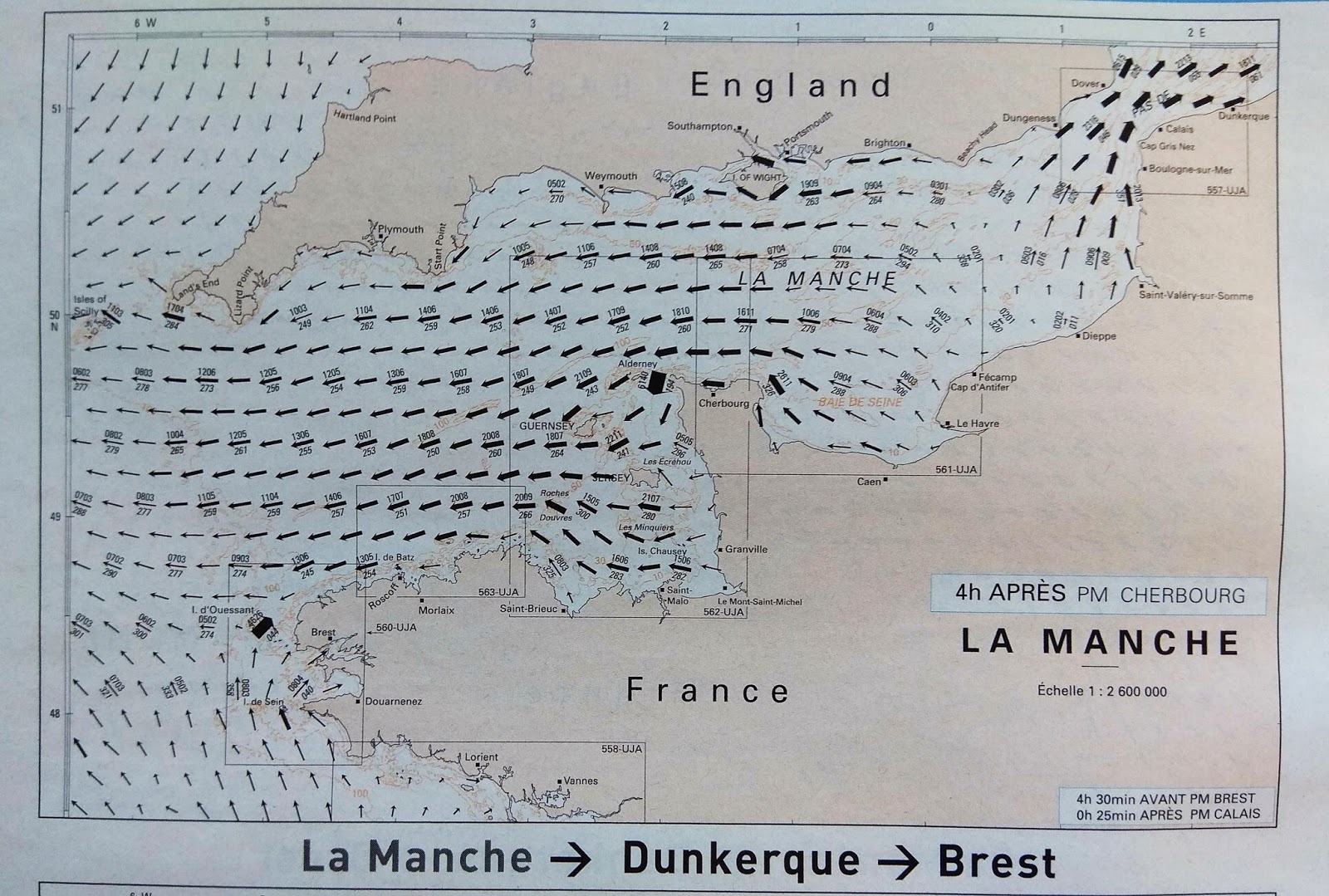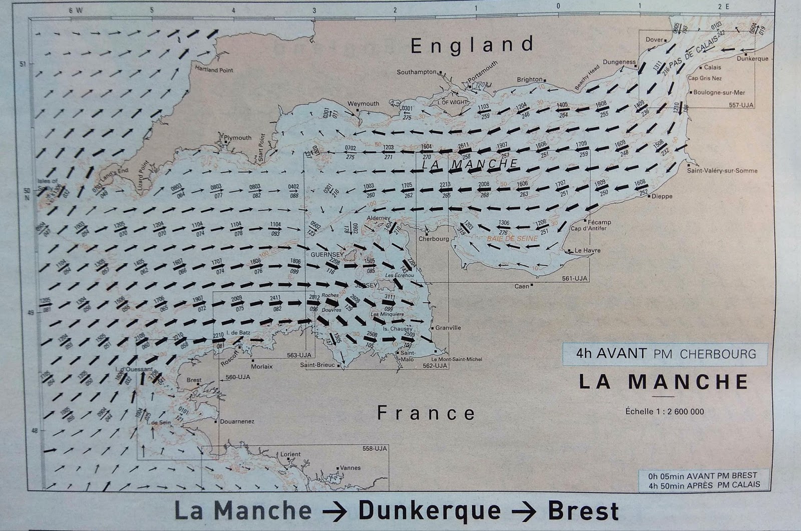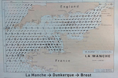 Como las 24 millas del paso, a 4 nudos, las recorrería en 6 horas, supongo que lo más lógico es salir de Calais a mitad de la marea vaciante y dejarme derivar las tres primeras horas hacia el Este, sin alterar el rumbo de compás para intentar inútilmente dirigir la proa hacia Dover. Pasaría por encima del depósito de explosivos, Tres horas después se invertiría la marea y ahora me haría derivar durante las tres horas siguientes hacia el Oeste, devolviéndome a la línea de derrota original al llegar cerca de Dover, a donde entraría en pleamar. En conjunto describiría un trak en forma de "S". Pero este planteamiento es fruto de una elucubración mía, y lo que haré seguro es preguntar a los mandamases de la Capitanía de Calais la mejor forma de atravesar, y por supuesto seguiré sus consejos.
