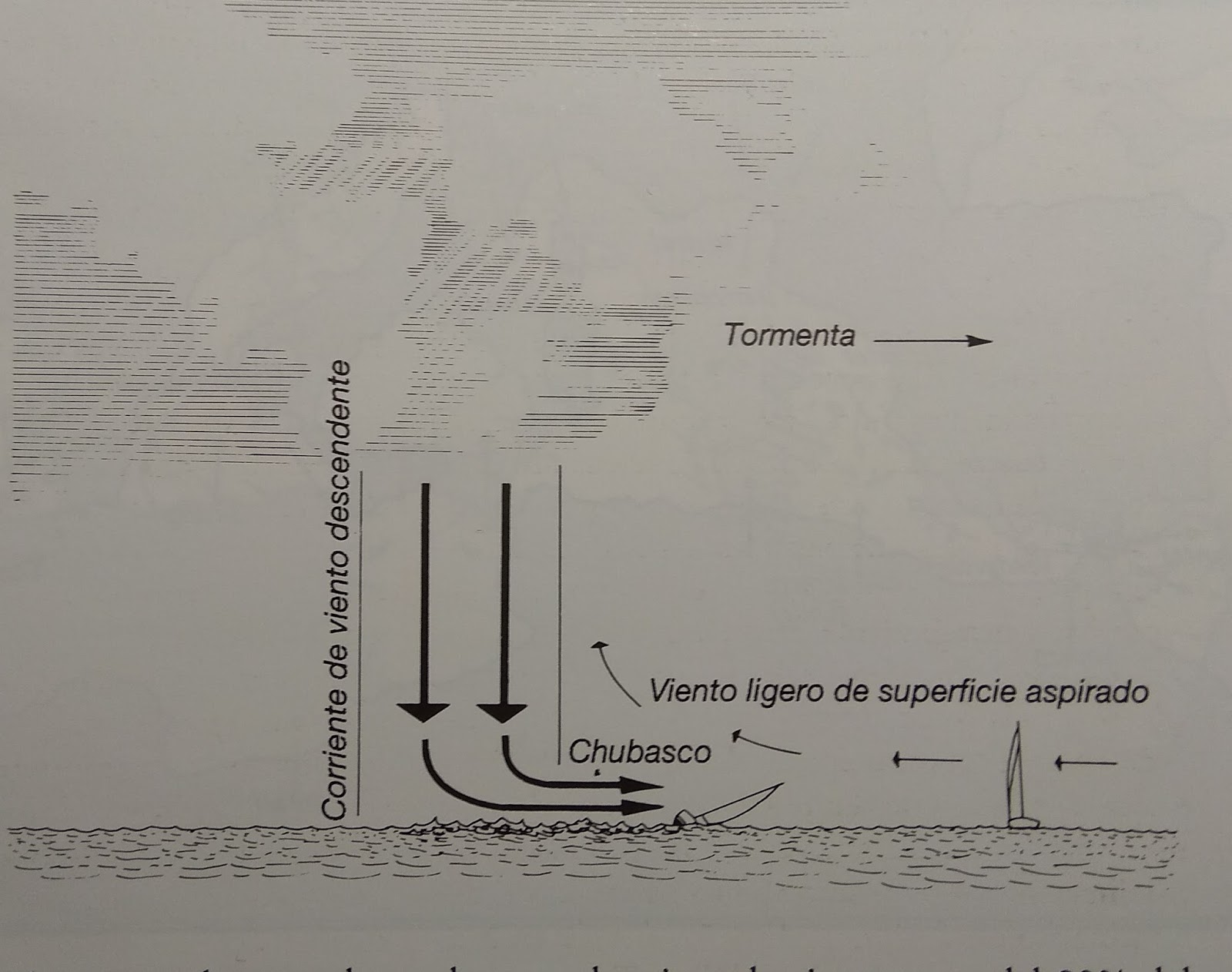Es lo que llamamos un chubasco, donde el viento sopla con cólera evangélica hasta los 40-50 nudos, que es fuerza 8 ó 10. Desde lejos se ve que la superficie del mar bajo la nube se vuelve blanca, por el agua revuelta por el viento y las salpicaduras de la lluvia. Si hay veleros se ve cómo los escoran las ráfagas, con los mástiles casi en la horizontal. Normalmente estas tormentas duran desde unos minutos a pocas horas, pero hay que evitarlas a toda costa.