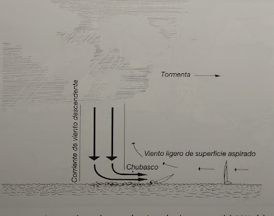 • Pensar que como el viento sopla de nosotros hacia la nube, se está alejando. En efecto, la nube absorbe aire de la superficie del mar en un círculo de algunos Km alrededor de su base, por lo que desde cualquier lugar que naveguemos tendremos la sensación de que está a sotavento. Se ve bien en la parte de la derecha de la figura anterior, donde el velero tiene la nube a sotavento aunque en realidad está avanzando hacia él.