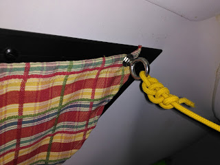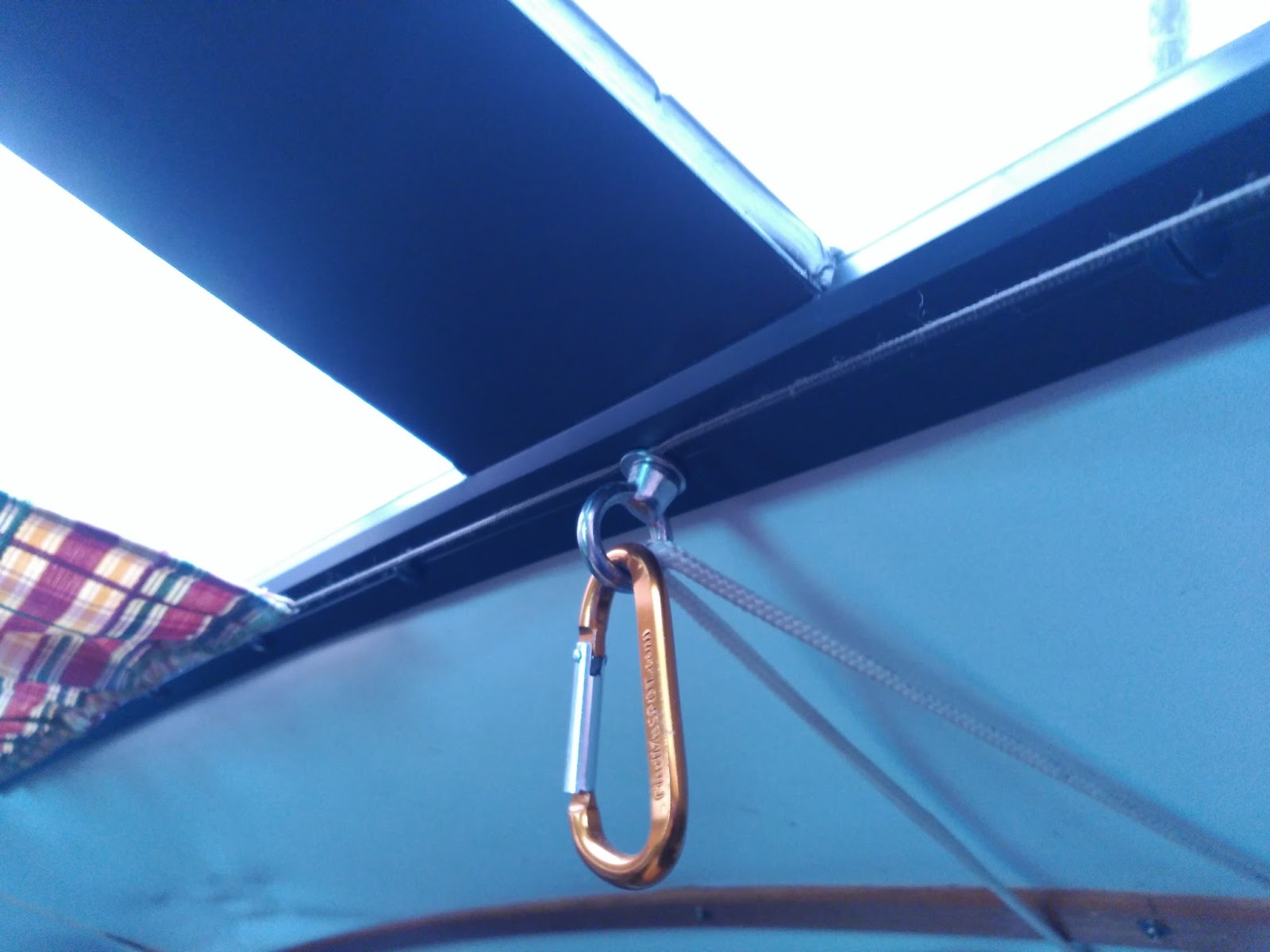 Os enseño dos tonterías pero que a mí me han hecho la vida más cómoda en el Tonic 23. En la ventana que da a la proa he sustituido uno de los tornillos que sujeta el marco por un cáncamo. Allí cuelgo el farolillo de camping gas y tengo luz justo encima de la mesa, lo que viene muy bien para las cenas tardías: