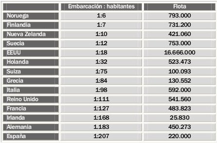 EMBARCACION:HABITANTES FLOTA NORUEGA 1:6 793.000 FINLANDIA 1:7 731.200 NUEVA ZELANDA 1:10 421.060 SUECIA 1:12 753.000 EEUU 1:18 16.666.000 HOLANDA 1:32 523.473 SUIZA 1:75 100.093 GRECIA 1:84 130.552 ITALIA 1:98 592.000 REINO UNIDO 1:111 541.560 FRANCIA 1:127 483.823 IRLANDA 1:168 25.830 ALEMANIA 1:183 450.273 ESPAÑA 1:207 220.000 Fuente: www.esade.edu/pfw_files/cma/GUIAME/Ficheros1/nautico08.pdf Unas para todos. |