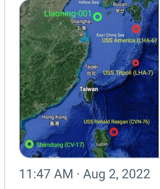 Sin desmerecer el potencial chino, sus portaaviones son bastante cutres. El CVN 76, fetiche de este Cofrade, es actualmente el Portaaviones mas potente de la Navy. A eso únele un par de submarinos nucleares de la clase Virginia y las fragatas de escolta y seguro que algún equipo Seal por si acaso