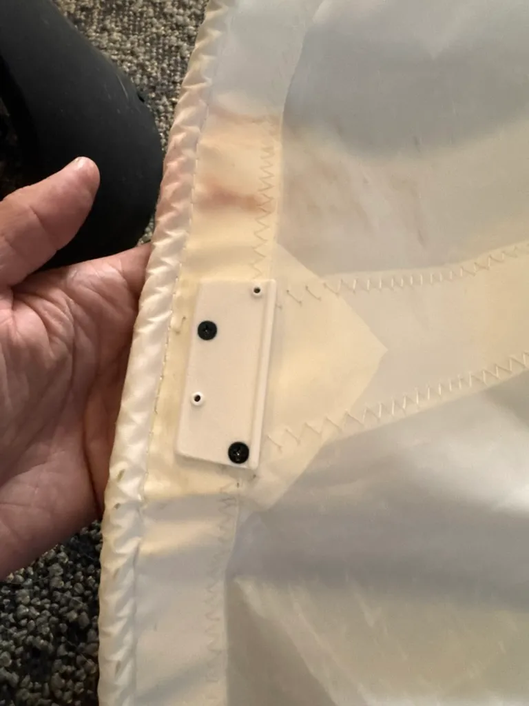Pues aquí va un pasacabos que me he hecho. Originalmente llevaba uno a cada banda,y son de algún material plástico. Uno estaba roto, pero desmonté la base y midiendo con un calibre la posición de los agujeros, pude replicar la pieza. Por el momento aguanta bien.