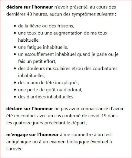 A falta de pocos días para la salida a Francia las cosas se ponen a cambiar a toda prisa (esta vez a mejor, que conste). España ha anunciado que a partir del lunes 7 se podrá entrar en el país solo con el certificado de vacunación (14 días tras finalizar la pauta). Es de esperar que otros países europeos hagan lo mismo. Yo de momento, para entrar en Francia, a pesar de estar vacunado tengo que hacerme una PCR el martes 8 y rellenar una declaración responsable con mis datos y el siguiente contenido: