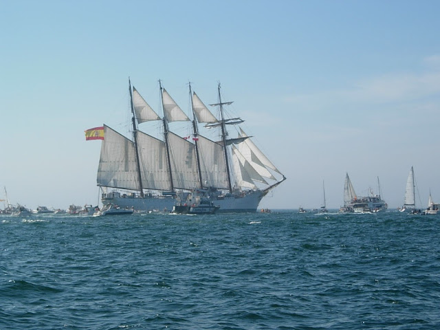 Al fondo el precioso Monte Buciero cubierto de encinares. Al día siguiente, después de otro baño porque el calor apretaba fuerte, salimos de vuelta con muy poco viento que no hacía andar al barco ni con el espí. Mucho motor, vaya. Y al llegar a la bahía nos cruzamos con el Juan Sebastián Elcano que se despedía de Santander. Navegamos un rato junto a él: