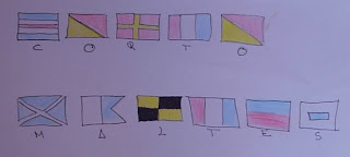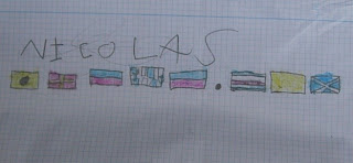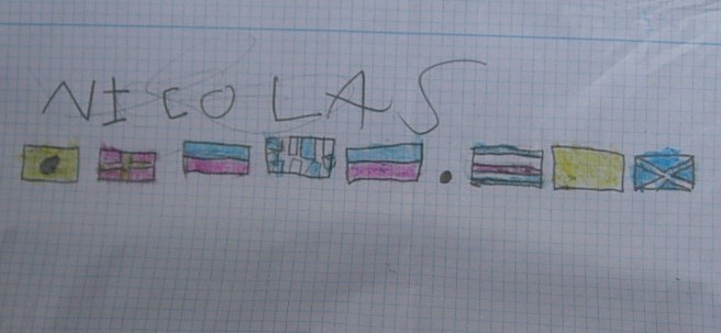 Y para terminar el trabajo de alguno de los niños, porque vienen a aprender y a veces les ponemos tarea. En este caso tenían que escribir el nombre del barco con el código de banderas: