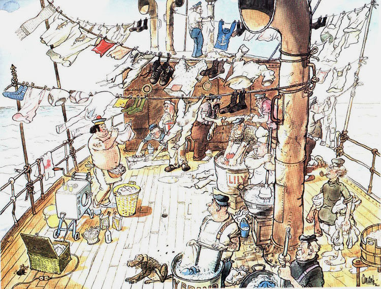 Despues de comer, meter todo lo sucio en una red-bolsa y largarla por popa; en minutos quedará "relimpia".