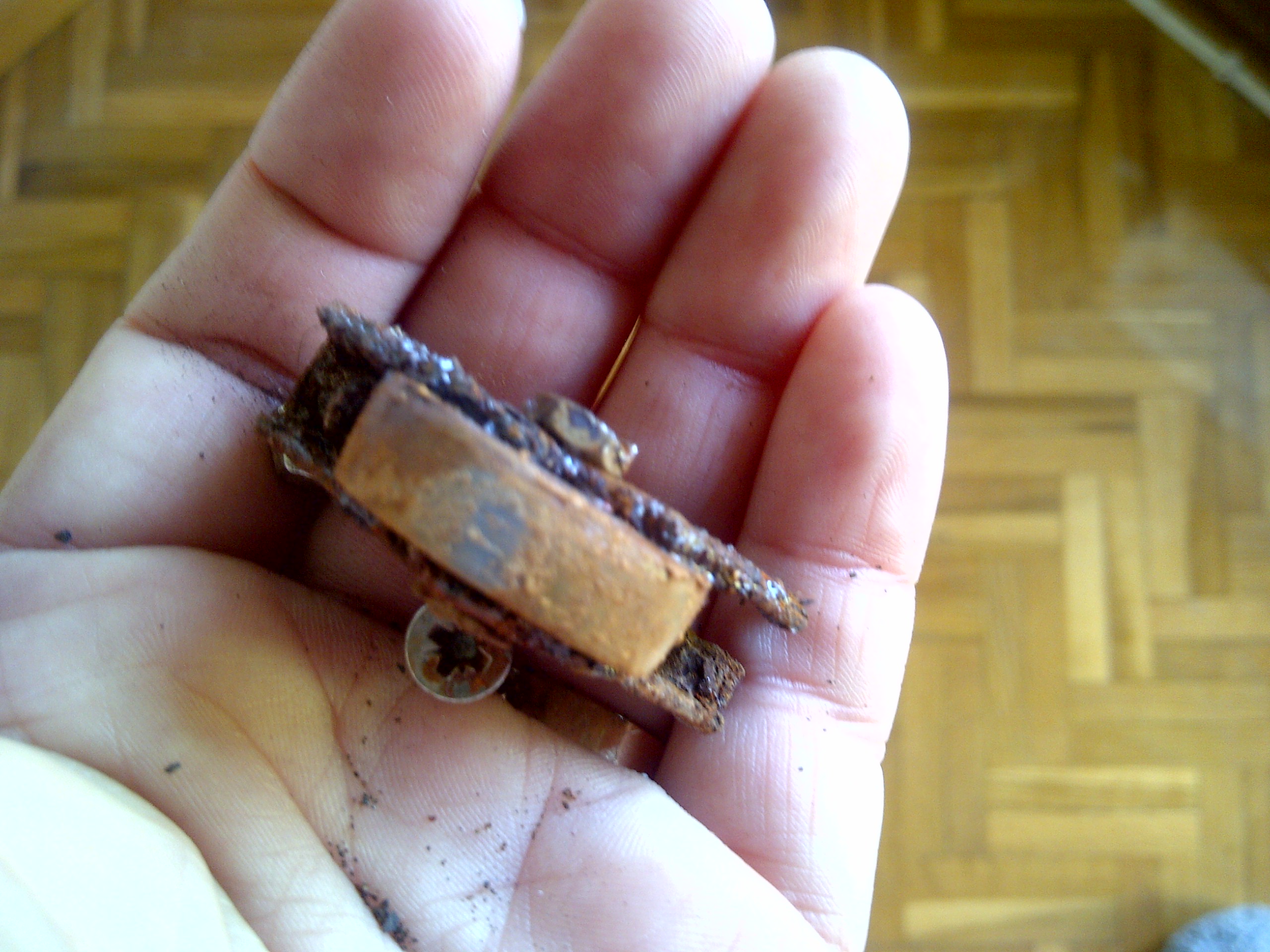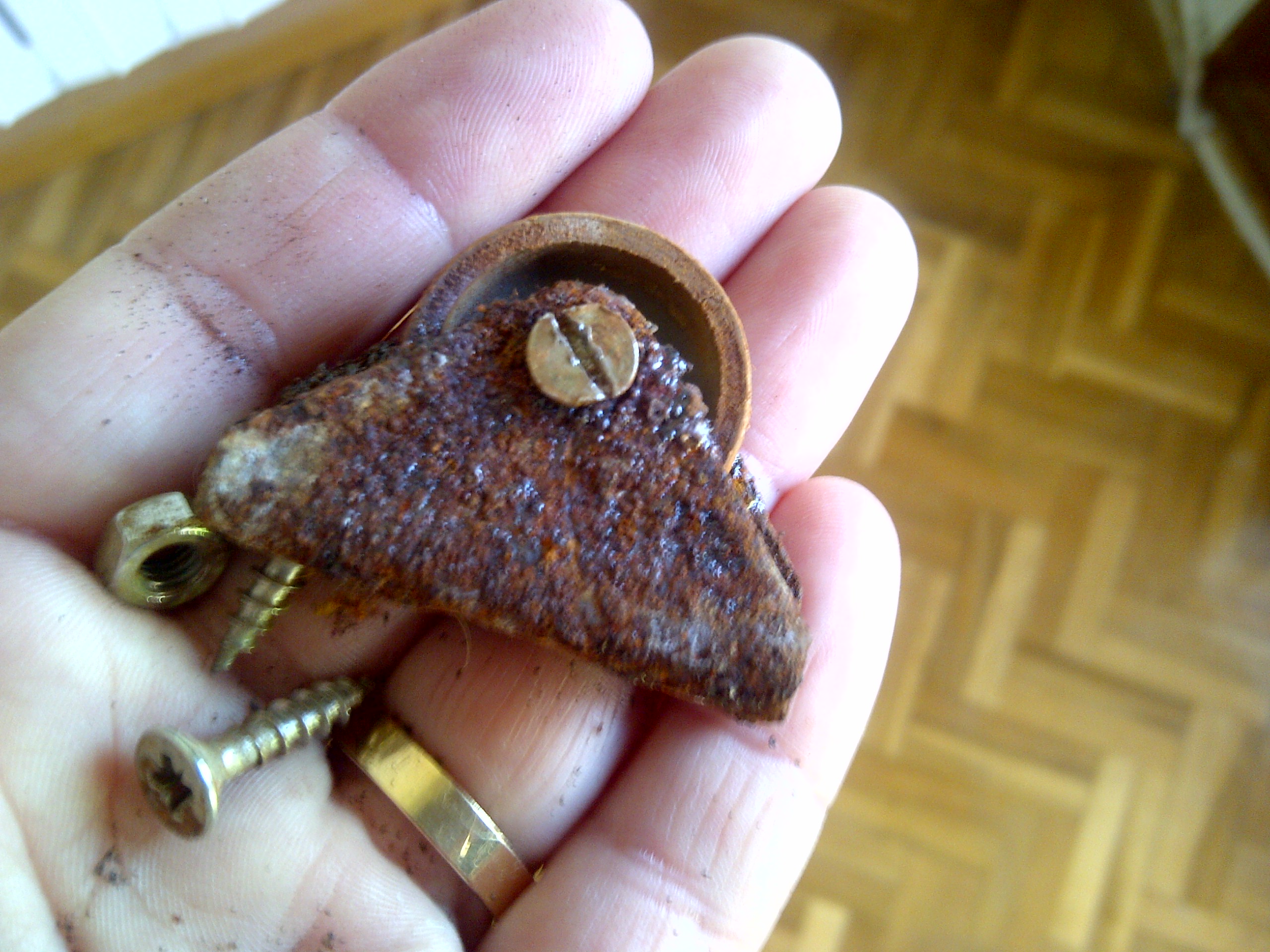 Son las ruedas de la puerta corredera de separación wc de la cabina.. Así estaban de asquerosas, y eso no se movía ni para atrás (normal), con lo que de momento, no hay puerta, la hemos quitado.