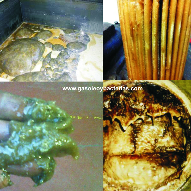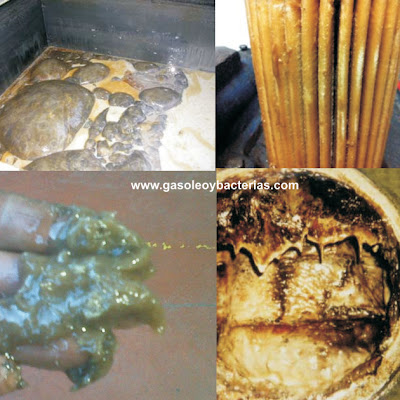 El Agua Para poder entender de una manera clara y resumida de la contaminación micro-biológica en combustibles hemos separado los tres principales elementos que entran en juego en éste fenómeno, en este apartado abordamos el Agua. A lo largo de los años se ha comprobado que la presencia de agua libre en un depósito o tanque de almacenamiento es la única posibilidad que hay para que exista un desarrollo de contaminación microbiana en el combustible. El agua propicia que bacterias, levaduras y hongos se desarrollen alimentándose del gasóleo y utilizando el agua (principalmente) como medio más propicio para su desarrollo. "Si hay contaminación, hay agua en el combustible, aunque sea una pequeña cantidad." Por diferencia de densidades entre el agua y los combustibles, el agua suele colocarse en la partes más bajas de los sistemas de combustibles, tuberías y depósitos. Puede encontrarse como una capa separada del combustible en el fondo de tanques pero también como una capa nebulosa de gotas microscópicas en suspensión en el gasóleo. No son necesarias grandes cantidades de agua en los combustibles para que se posibilite el desarrollo de colonias de microorganismos, para algunos tipos de bacterias y hongos pequeñas cantidades de agua son suficientes para su desarrollo. Origen del agua en el combustible. 1. Presencia legal de agua en los GASÓLEOS. El agua siempre ha estado presente en los combustibles en una mayor o menor proporción. En España en la actualidad el límite máximo de presencia de agua en los gasóleos esta fijada por ley en los 200 mg/kg. Esta presencia legal de agua no representa ningún problema ni para la estabilidad del propio combustible ni para su uso ya que se encuentra emulsionada (mezclada) con el producto. 2. Condensación. La oscilación de temperaturas en el combustible produce tanto la evaporación del agua emulsionada en el combustible, como la condensación de la humedad que hay en el aire que ocupa las partes vacías de los depósitos de almacenamiento. Partículas pequeñas de agua se acumulan y aglutinan en la parte alta de los depósitos y cuando varias gotitas de agua se juntan entre sí se van hacia el fondo del tanque de combustible. Gota a gota se genera un pie de agua (fondo de agua) en los tanques de almacenamiento. 3. Decantación. Una escasa rotación del producto puede propiciar que el agua emulsionada en el gasóleo se separe por sedimentación en el fondo del depósito o tanque donde se encuentra almacenado. 4. Higroscopia - Absorción de agua ambiente. El incremento ene l porcentaje de mezcla de biocarburantes, principalmente el biodiesel, puede hacer que esta vía de captación de agua se haya hecho más importante. El FAME (biodiesel) es un producto que tiene una capacidad de higroscopia mucho mayor a la que ya tenia el propio gasóleo. 5. Aporte exterior de agua. De manera accidental durante la utilización de las instalaciones o por defectos de diseño de las mismas, el agua puede llegar al tanque de combustible por: conexiones, uniones y juntas defectuosas, acumulación de agua en arquetas (muy habitual) tapas, etc... También cabe la posibilidad de que el aporte de agua pueda haberse introducido por un problema en la cadena de suministro (aguas de lastre de barcos cargueros, vaporizado de cisternas …) y que aun teniendo la instalación perfectamente mantenida y vigilada el aporte de agua nos venga de otro punto de la cadena de suministro que escapa a nuestro control directo. Los Microorganismos Para poder entender de una manera clara y resumida de la contaminación micro-biológica en combustibles hemos separado los tres principales elementos que entran en juego en éste fenómeno. En este apartado abordamos los Micro-organismos. Las bacterias, hongos y levaduras, son microorganismos de unos pocos micrómetros de tamaño. Para proliferar requieren agua, temperatura y nutrientes. "Existe una gran variedad de microorganismos que pueden producir la contaminación del gasóleo. Lo que hace necesario la utilización de biocidas que tengan un amplio espectro y eficacia demostrada." Existen en todos los ambientes (agua, polvo, aire…) microorganismos que pueden afectar a los hidrocarburos y que son capaces de entrar en contacto con el combustibles por varias vías: Origen de los microorganismos en los combustibles. Partículas en suspensión: Partículas de polvo y agua en el aire pueden ser portadoras de bacterias y hongos y llegar a entrar en contacto con los hidrocarburos a través de las ventilaciones de los tanques, escotillas abiertas, etc. Agua: El agua que se pueda introducir accidentalmente en la cadena de suministro es una eficaz fuente de contaminación ya que puede arrastrar todo tipo de microorganismos al interior del tanque aportando de una vez no sola vez no solo el problema sino el medio propicio para el desarrollo. Contacto con acoples o conducciones contaminadas: Es difícil de enumerar los posibles focos de contaminación, pues pueden llegar a ser tantos y tan variados... ¿Qué efecto producen? Cuando las bacterias, hongos y levaduras, encuentran un medio propicio para su desarrollo (agua, nutrientes y temperatura) comienzan a alimentarse del combustible y a excretar toda una seria de desechos que perjudican tanto a la calidad del propio combustible como a los tanques de almacenamiento y a los sistema de combustible de maquinas, barcos y vehículos, ya que suelen ser compuesto químicos que producen corrosión, acidez y otros efectos no esperados ni deseables. Esquema - Estructura de un BioFilm Los microorganismos suelen ser propensos a establecer comunidades (estructuras) en su desarrollo. Cuando los microorganismos colonizadores se establecen empiezan a producir un mucosa densa de biopolimeros para proteger las nuevas células de las condiciones agresivas del medio. Estos biofilms son complejas estructuras de microorganismos que trabajan y dan soporte a una comunidad de microorganismos aeróbicos y ana
