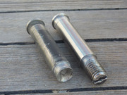Calibre en mano, saqué los croquis de las piezas que había que sustituir: los ejes y las roldanas. Decidí que el eje tendría que ser desmontable (de modo que las roldanas se puedan cambiar fácilmente si se vuelven a desgastar), lo que requiere un extremo roscado y la correspondiente tuerca. Además el eje debería llevar una ranura para el destornillador, que preferí situar en el extremo roscado, donde un debilitamiento del material tiene menos importancia. Esto último tampoco es crítico, pues la rosca no soporta carga, sino que sirve únicamente para que el eje no se salga del cuerpo del escotero. De acuerdo con las dimensiones del eje, la tuerca más adecuada resultó ser una M10 autoblocante,