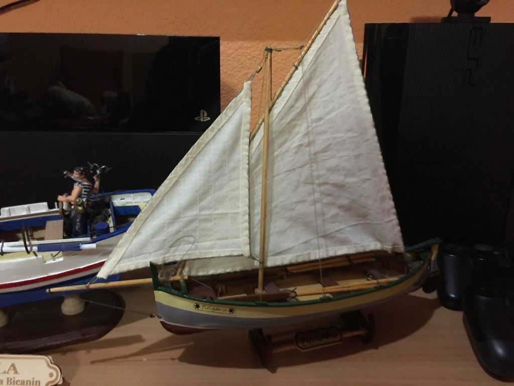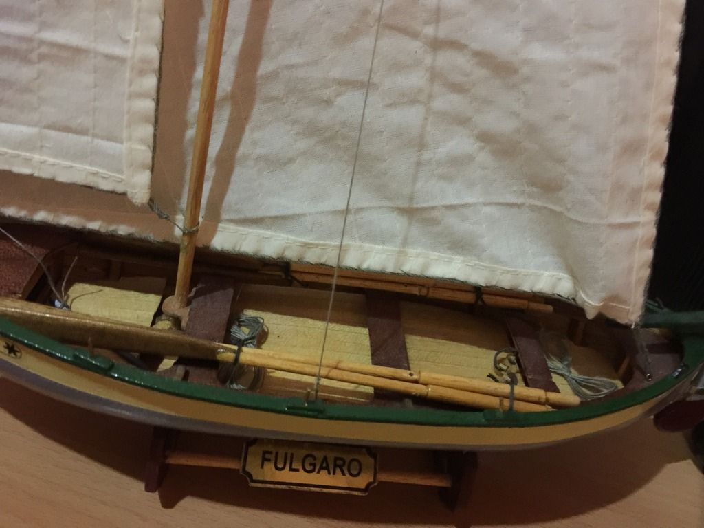 Dejo aqui una maketa hecha a mano que compre por mil anuncios me llego desde Jaen y el mismo tipo la ha montado mano.Es una barca pesquera tipica del mediterraneo llamada Fulgaro aver que os parece.Me costo 20€ mas 16€ gastos de envio.