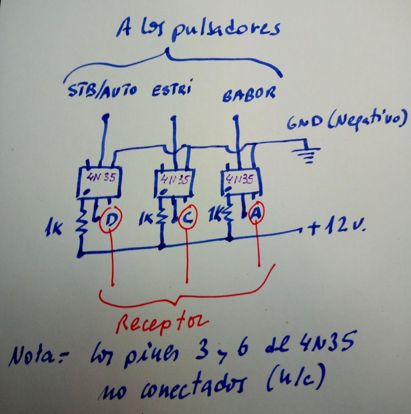 Tomad asiento y os cuento mi última "frikada" electrónica. Siguiendo la estela de los cofrades Rprafa (https://foro.latabernadelpuerto.com/...ad.php?t=90653) y Aloes (http://aloes-farodelpicacho.blogspot...g-page_13.html) (¡Muchas gracias!) me propuse, tras la reparación de mi piloto de caña Simrad TP20, ya envalentonado, instalar un mando a distancia inalámbrico. Compré en Banggood (https://es.banggood.com/433MHz-12V-4...r_warehouse=CN) un mando a distancia y su receptor (en realidad te dan dos mandos y el receptor) ![]() Creo que me salió por menos de 12€ (los había mas baratos pero éste tenía buena pinta). Como me había estudiado el esquema electrónico de la placa del TP20 vi que los pulsadores que me interesaban eran todos el contacto de un terminal de un circuito integrado con el negativo, con lo cual el negativo podía ser común para todos. ![]() Para mayor abundamiento y por mi aprendizaje con el Arduino había descubierto lo simple que es utilizar un optoacoplador (es un pequeño chip que contiene un diodo electroluminiscente o LED y un foto-transistor) que permite aislar eléctricamente el circuito de comando con el que es controlado de tal modo que evitas cualquier efecto indeseado. Es como un relé, pero en lugar de ser mecánico, es electrónico y de mínimo consumo, sin interferencias magnéticas ni desgaste de contactos, etc. Yo he usado el 4N35. La otra ventaja es que, al eliminar los relés, el circuito se puede reducir mucho en tamaño. Ni corto ni perezoso desoldé los relés mas cercanos a la electrónica del receptor. Con una pequeña sierra corté el circuito impreso separando la parte de los relés. ![]() ![]() ![]() Identifiqué las pistas que activaban los relés y monté un pequeño circuito con tres 4N35 (Aunque el mando tiene cuatro canales yo sólo pensaba usar tres para los pulsadores de +1 (+10) babor y estribor y el de auto/standby. La ventaja del Simrad es que el mismo pulsador sirve para +1 o +10 (cuando la pulsación es mas larga y entonces da dos pitidos en vez de uno). Una vez conseguido lo probé con unos LEDS y funcionaba bien. http://www.uv.es/edumursa/shared/mando01.mp4 Así lo he tenido unos dos meses porque no podía ir donde tengo el barco (y el piloto). Pude ir hace poco y pensaba traerme el piloto a casa para hacerlo con mayor comodidad (donde tengo lámpara lupa y todas las herramientas mas adecuadas) pero al final me atreví a hacerlo allí, no sin cierto temor a pifiarla. Conseguí meter los 5 cables, dos de alimentación a 12 volts (positivo y negativo) y los tres que iban a llevar el negativo a cada uno de los tres pulsadores, lo que equivale a que hubieras pulsado el botón, puesto que al recibir la señal del receptor en ese canal se activa el LED interno del 4N35 y deja pasar el negativo en los contactos de salida. Aquí os pongo mi esquema. ![]() Conseguí incluso pasar los cables junto a los demás cables que entran al compartimento de la placa del piloto (En éste, a diferencia del Raymarine la placa de electrónica y el compás electrónico tienen una cubierta adicional estanca [se supone] que los separa del motor y la parte mecánica del piloto). Hice las soldaduras en el extremo opuesto al contacto de masa (o negativo) de los tres pulsadores y me quedó muy bien. Como habreis visto en las imágenes había incluso metido el circuito receptor con mi circuito añadido en una cajita plástica diminuta de las de electrónica pero luego ví que no cabía bien en el hueco que me queda en la carcasa del piloto y puse la placa sola envuelta en plástico para evitar malos contactos. Debido al estado de excitación en que me encontraba por mi atrevimiento no tomé fotos de esta parte, quizá si algún día vuelvo a desmontarlo las haga. Situé la placa justo detrás de la placa con los sensores de efecto Hall que tiene el piloto (que le sirven para monitorizar el movimiento de giro del engranaje y su sentido ya que en ese engranaje van encastrados dos pequeños imanes). Y, voilá, funciona! Lo podeis ver en estos videos. http://www.uv.es/edumursa/shared/mando02.mp4 http://www.uv.es/edumursa/shared/mando03.mp4 Eso es todo lo que quería contaros por si os interesa. Si habeis llegado hasta aquí, gracias por la atención y espero que la bebida os haya refrescado el gaznate. Otra ronda! |